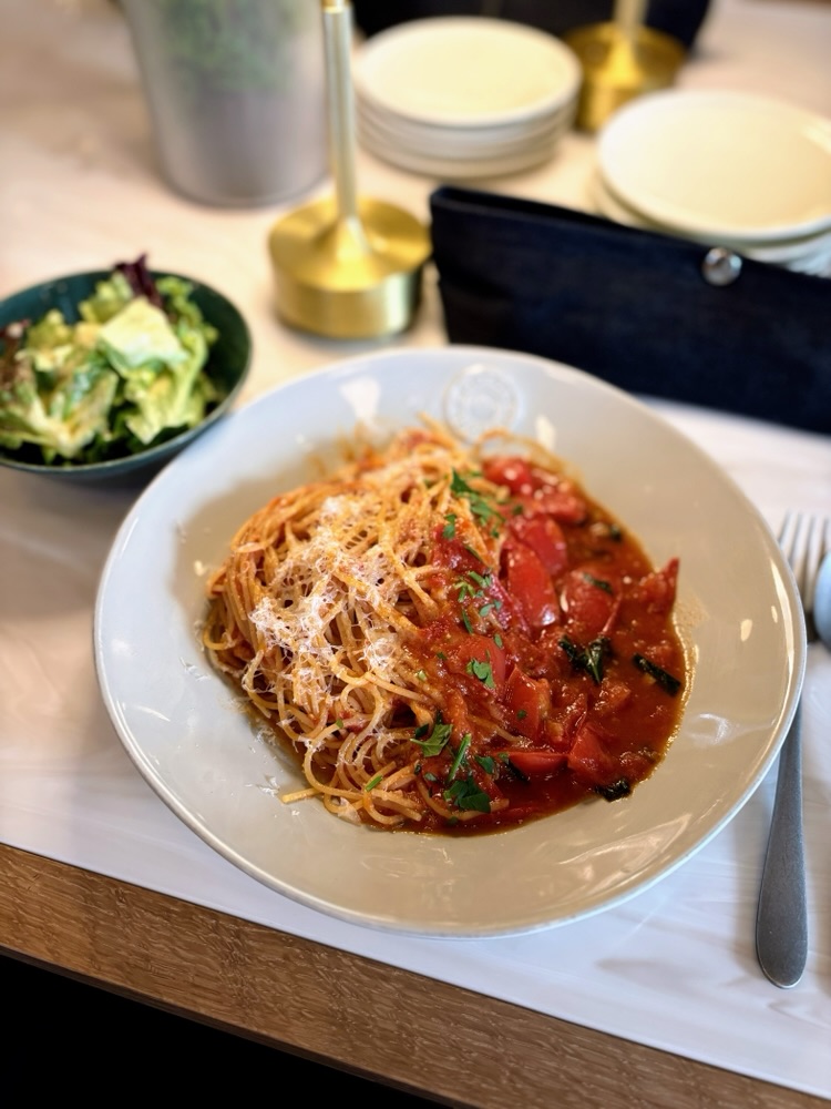 今回はランチで訪問。静岡アメーラトマトのフルーツトマトパスタ(サラダ・ドリンク付1600円)は甘いフルーツトマトがたっぷり。