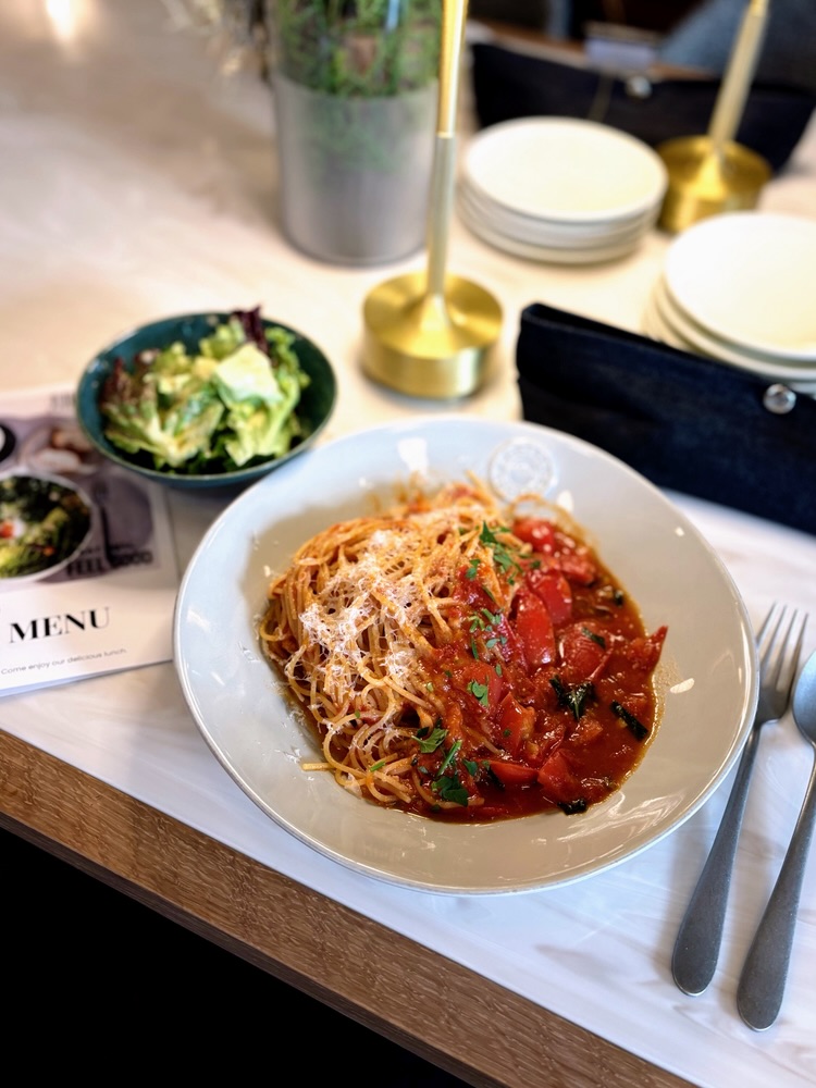 今回はランチで訪問。静岡アメーラトマトのフルーツトマトパスタ(サラダ・ドリンク付1600円)は甘いフルーツトマトがたっぷり。