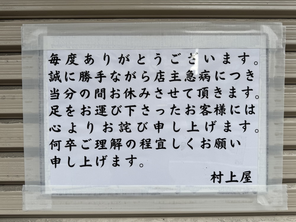 近隣にある「村上屋餅店」は店主さん急病のため休業中です。