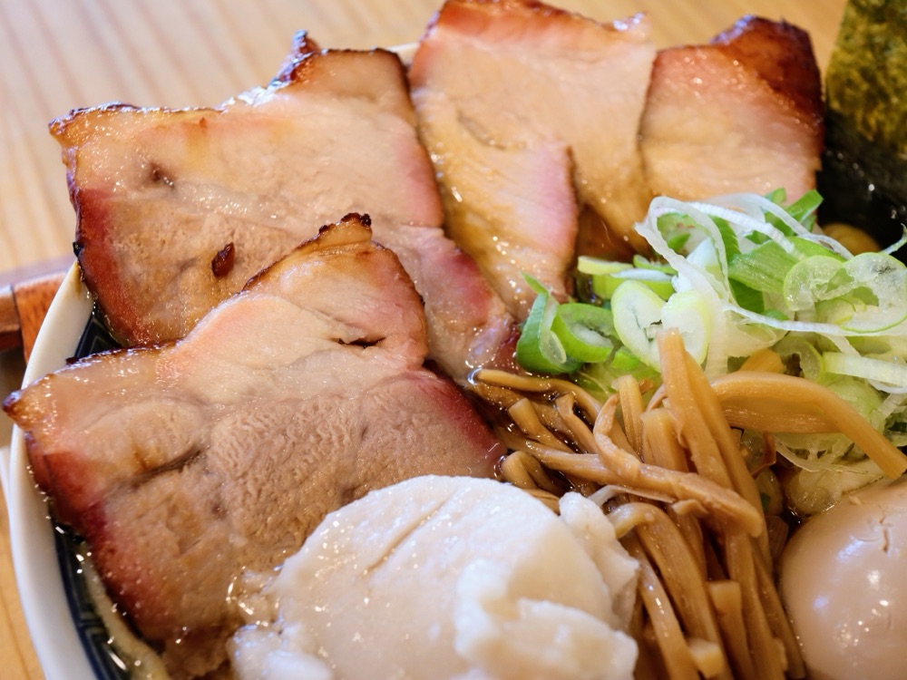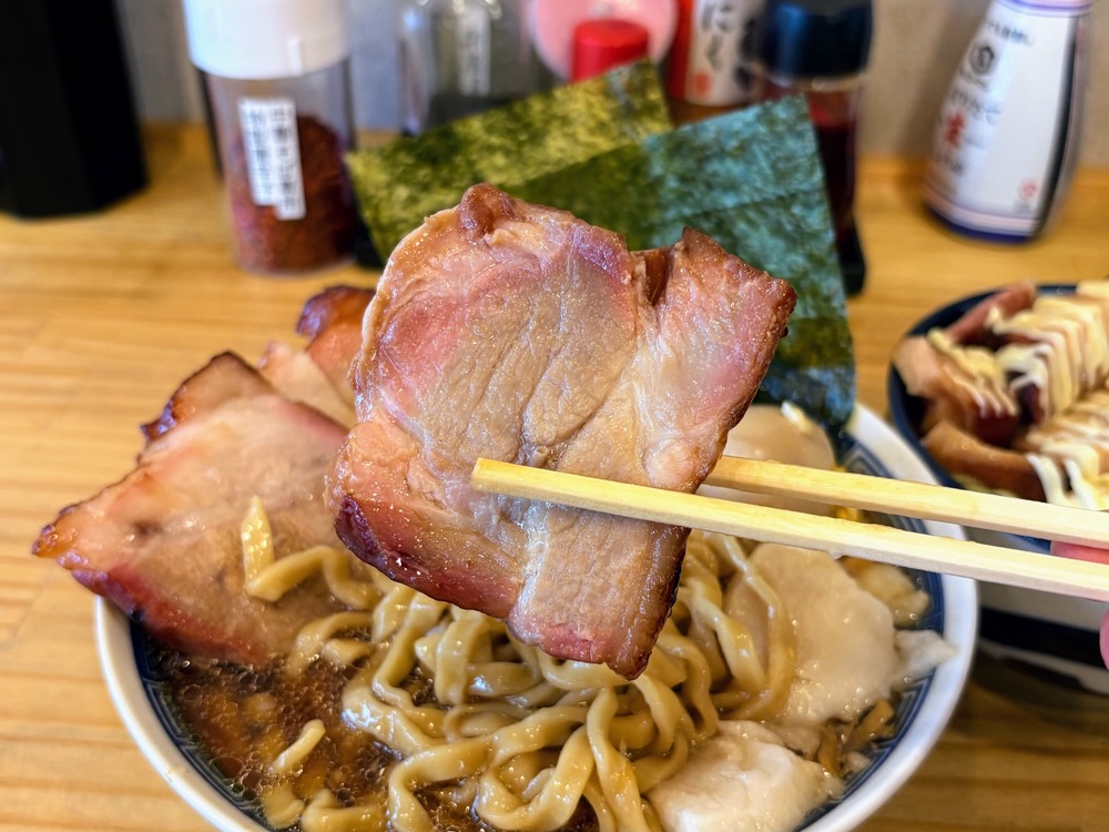 自家製チャーシューは驚きの特大肉厚サイズでボリュームが凄い。