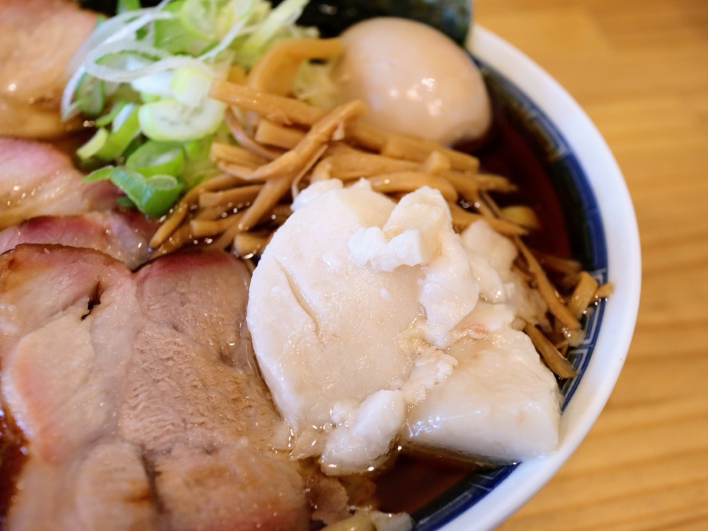 中華そば並盛チャーシュー増しを、身入りと味玉トッピングでいただきました。