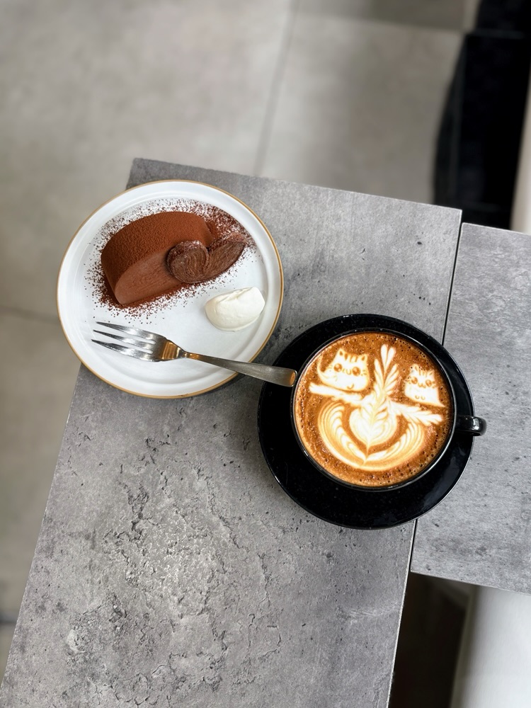 オリジナルラテアートのほか、チーズケーキや季節限定のテリーヌも人気です。