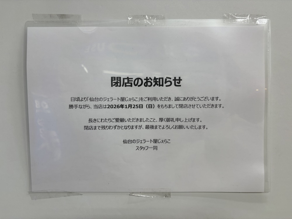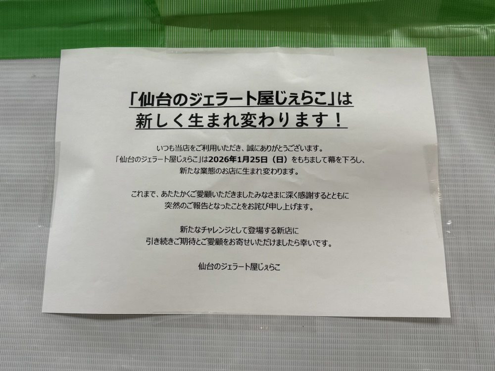 仙台駅前のジェラート店が1月25日をもって閉店に