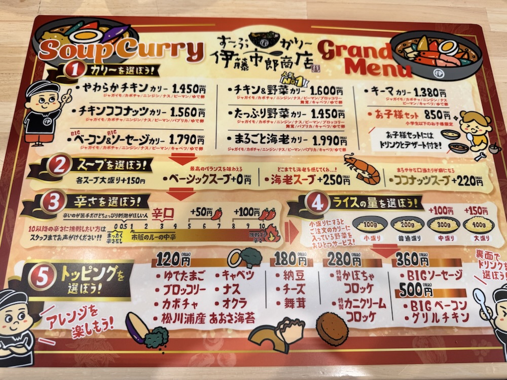 メニューはカレー、スープ、辛さ、ライスの量、トッピングを選べます。