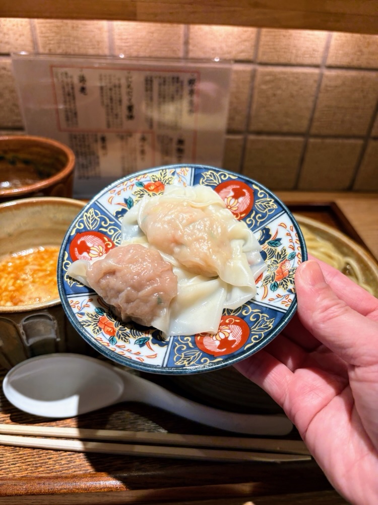 「つけ汁2種ちょっとずつつけ麺」を釜揚げでいただきました。こちらは肉ワンタン1個、海老ワンタン1個、味玉入りの1番人気メニュー。