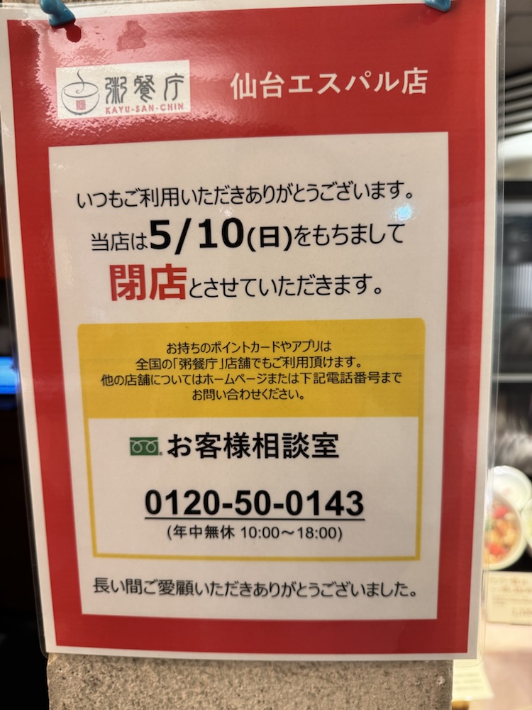 おかゆと麺 粥餐庁 仙台エスパル店|閉店の告知