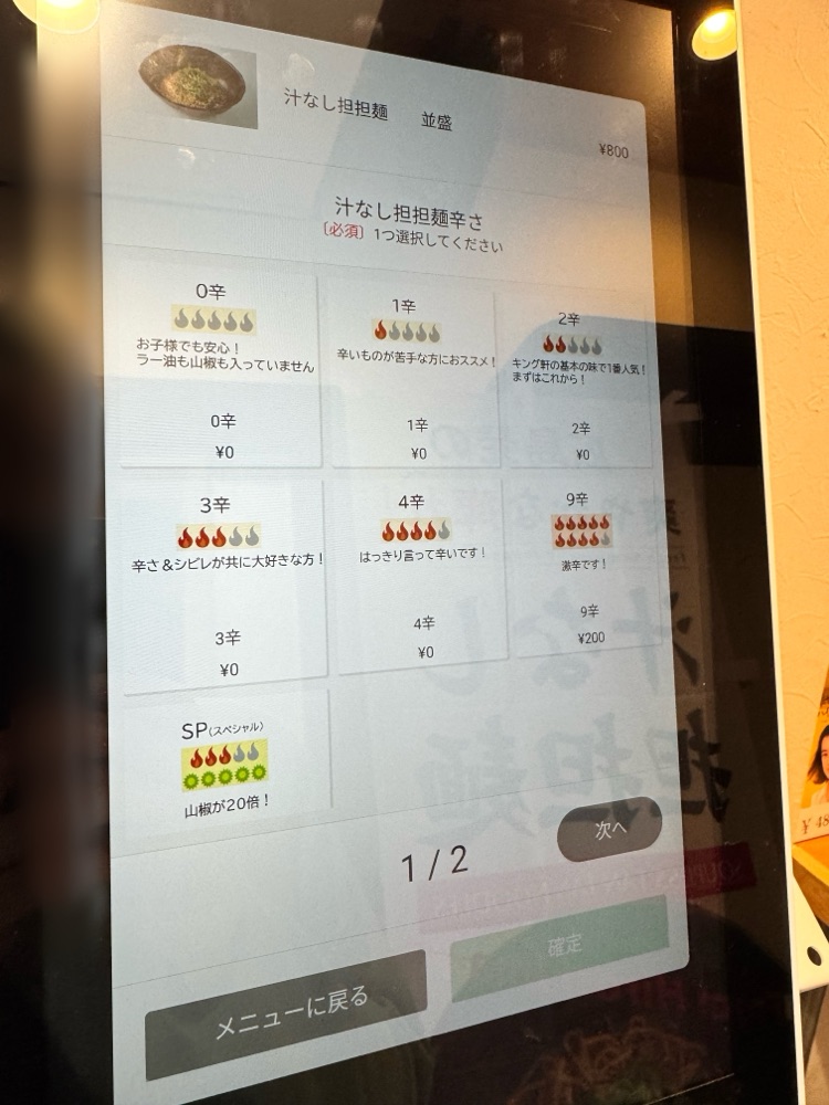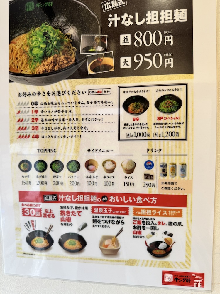汁なし担担麺は並が800円、大が950円。4辛まで無料です。