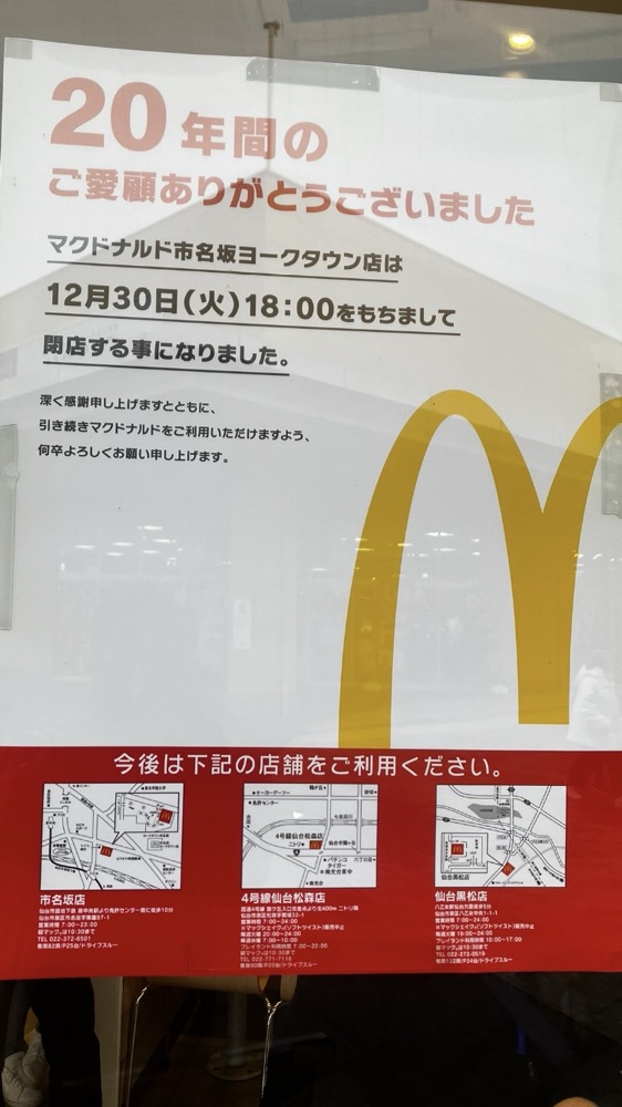 仙台市泉区のマクドナルドが12月30日をもって閉店に