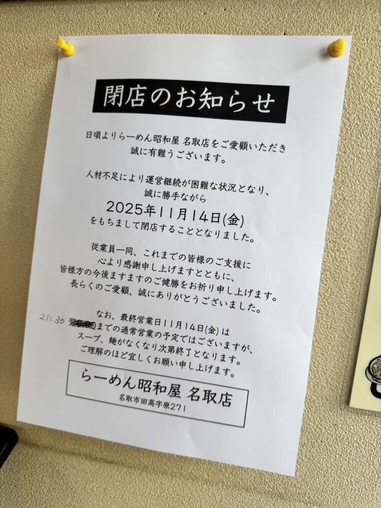 宮城県名取市の「ら〜めん昭和屋 名取店」が閉店するそうです。