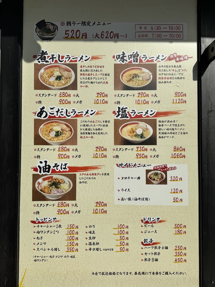 平日は朝6時30分から、土日祝は7時から朝ラーを提供。