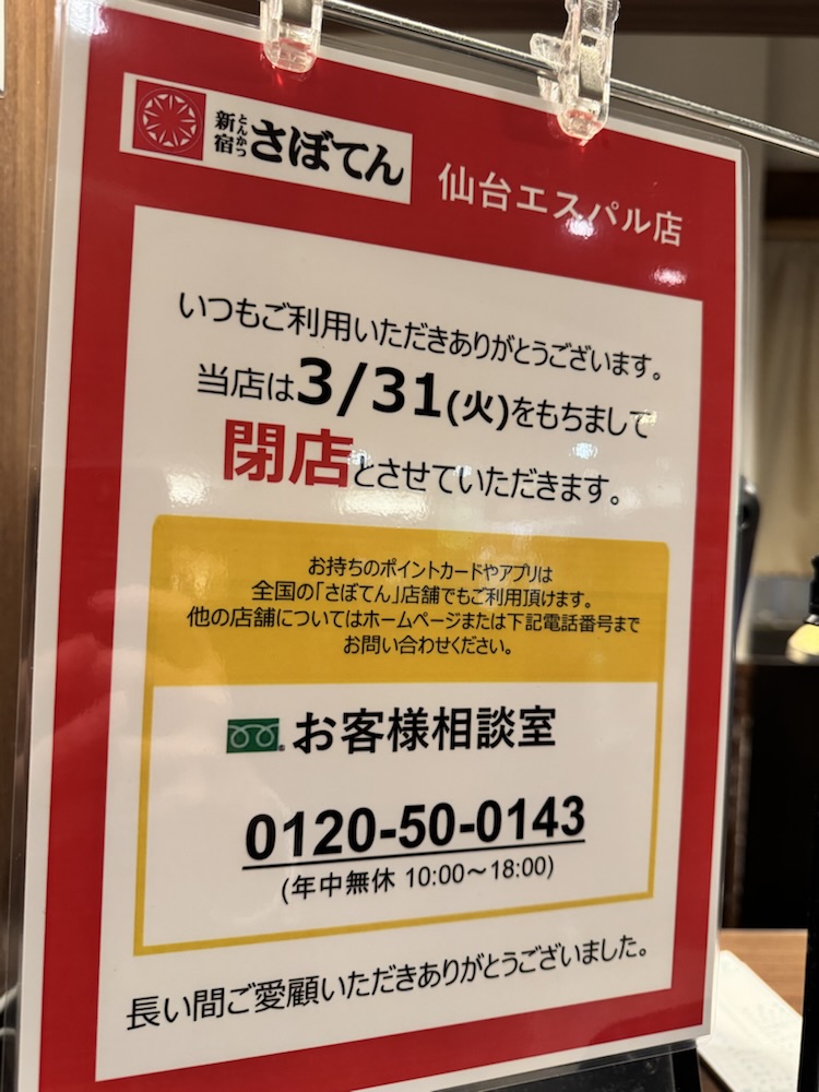 仙台駅の「とんかつ新宿さぼてん 仙台エスパル店」が閉店するそうです。
