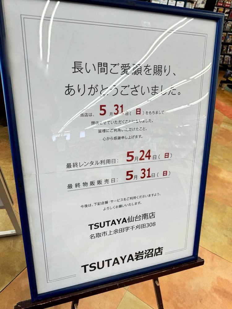 宮城県名取市の「TSUTAYA岩沼店」が閉店するそうです。