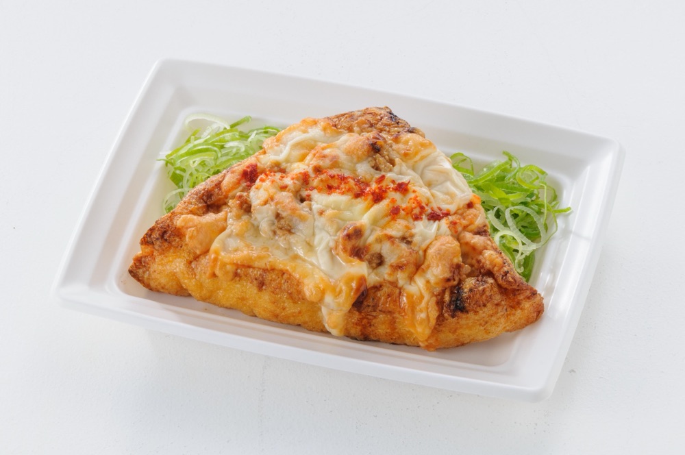 肉厚で外は香ばしく、中はふっくらとした三角油揚げの旨みを活かすため、コクのある肉みそとチーズを合わせ、ピザ風仕立てに。