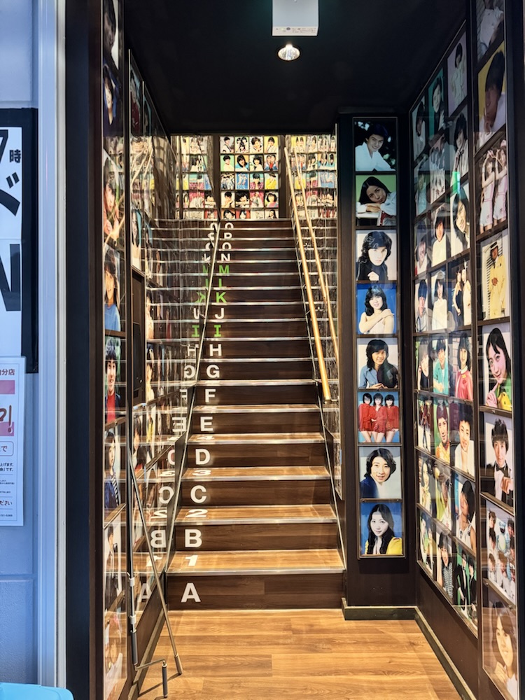 ▼店への階段は昭和アイドルたちのプロマイドがお出迎え